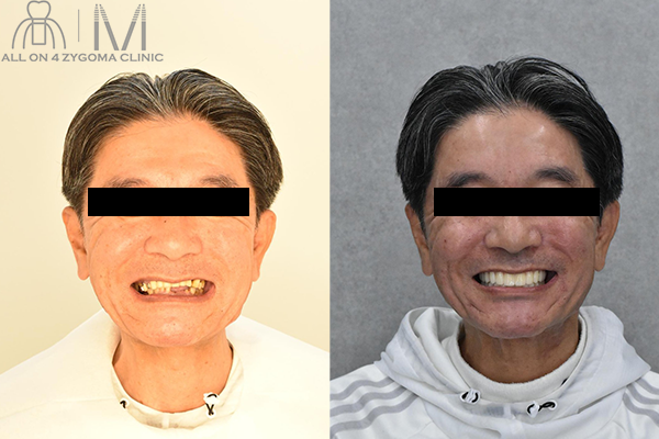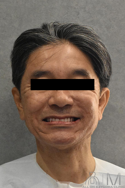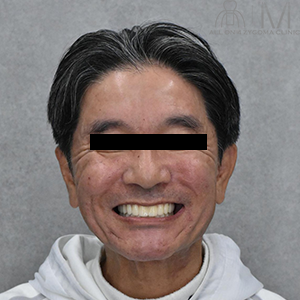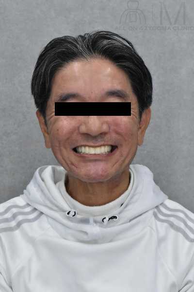 上下顎オールオン4ザイゴマインプラント を行う事で、審美性の高いスマイルラインを獲得できた。 ご本人様からは「今回、下だけでなく上下の手術をして本当に良かったです。」との事だった。