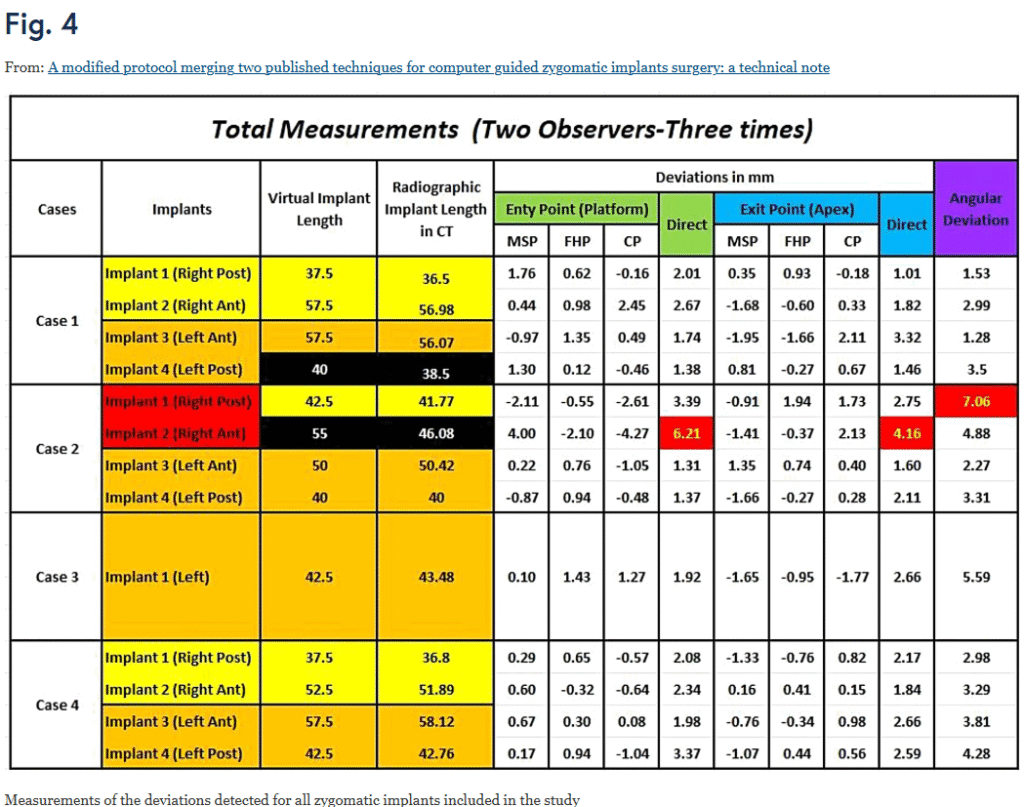 その結果、ザイゴマインプラントにおける平均エントリーポイント偏位は 2.77 ± 1.61 mm、出口偏位は 4.46 ± 3.16 mm、角度偏位は 5.14° ± 2.59°であった。